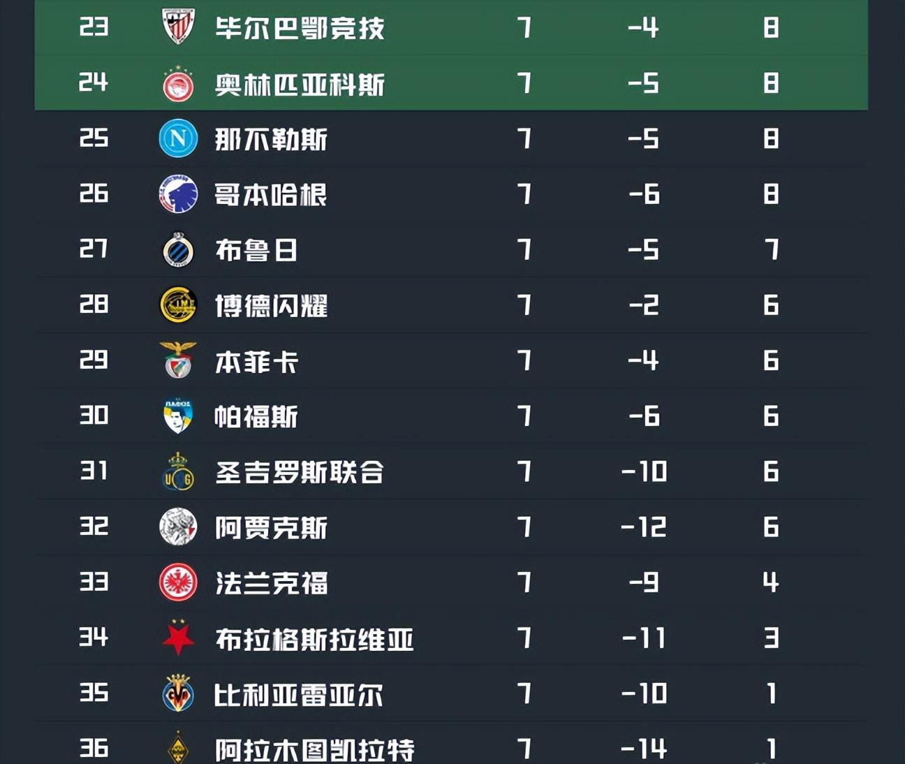 从第19位的马赛开始一直到第32位的阿贾克斯,这14支球队都已经不可能进入前八,末轮他们只能是争取淘汰赛附加赛的参赛资格。另外积分榜末尾的法兰克福、布拉格斯拉维亚、比利亚雷亚尔和阿拉木图凯拉特均已提前无缘淘汰赛附加赛,提前一轮宣告出局。
